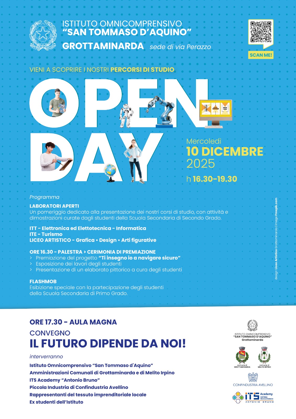 Un pomeriggio dedicato alla presentazione dei corsi di studio, con attività e dimostrazioni curate dagli studenti ed un convegno dal titolo "Il futuro dipende da noi" per analizzare le esigenze del mondo produttivo locale: Open Day all’Istituto Omnicomprensivo “San Tommaso d’Aquino” plesso di via Perazzo, questo pomeriggio dalle 16:30 alle 19:30.