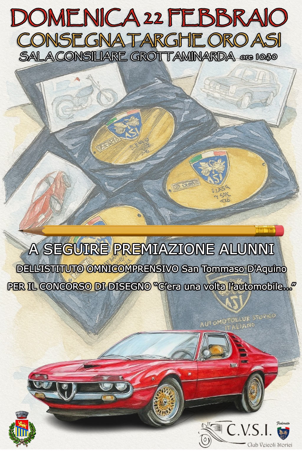 Domenica 22 febbraio a partire dalle ore 10:30 nella Sala “Sandro Pertini” di Grottaminarda si terrà la cerimonia di consegna delle “Targhe Oro ASI” e la premiazione del concorso di disegno “C’era una volta l’automobile...” che ha visto protagonisti gli alunni dell’Istituto Omnicomprensivo San Tommaso d’Aquino.