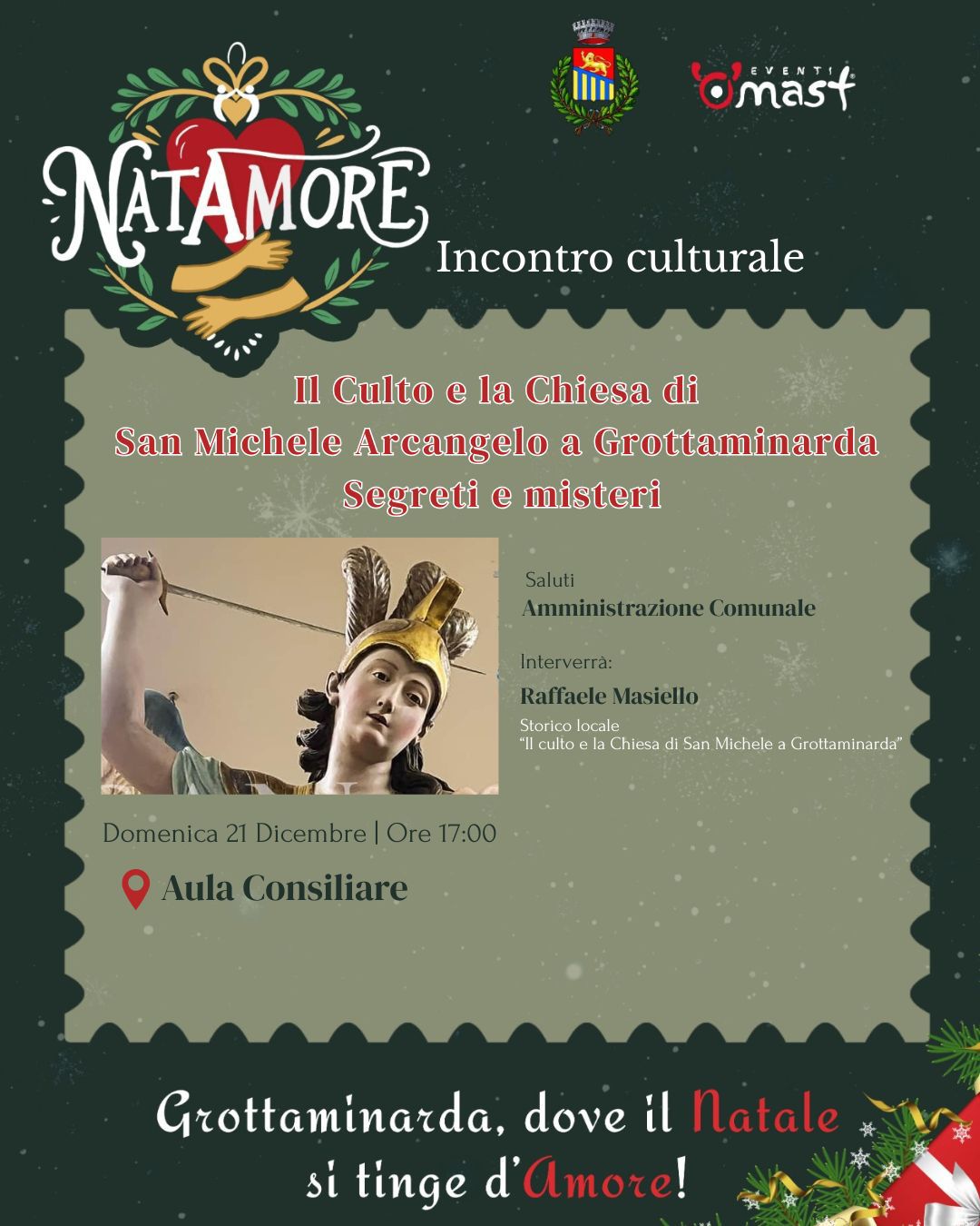 “Il Culto e la Chiesa di San Michele Arcangelo a Grottaminarda - Segreti e misteri”, questo l'affascinate tema tra devozione e tradizioni dell'incontro culturale in programma nell'ambito del cartellone di eventi natalizi "NatAmore" per domani, domenica 21 dicembre 2025, ore 17:00, nell' Aula Consiliare “Sandro Pertini”.