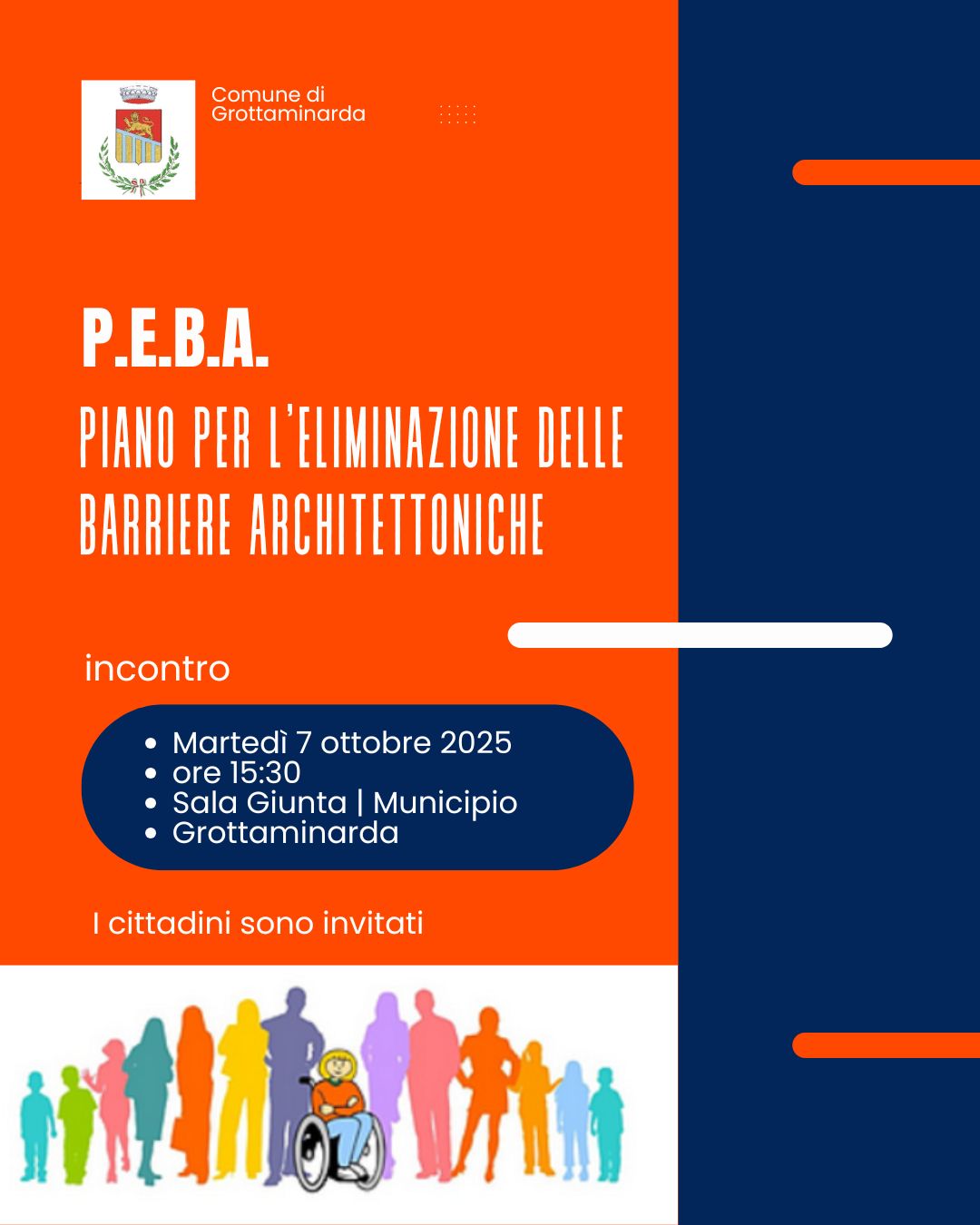 Martedì 7 ottobre, alle 15:30, nella Sala Giunta del Municipio di Grottaminarda, si terrà un nuovo incontro per la redazione del P.E.B.A. (Piano per l'eliminazione delle barriere architettoniche).