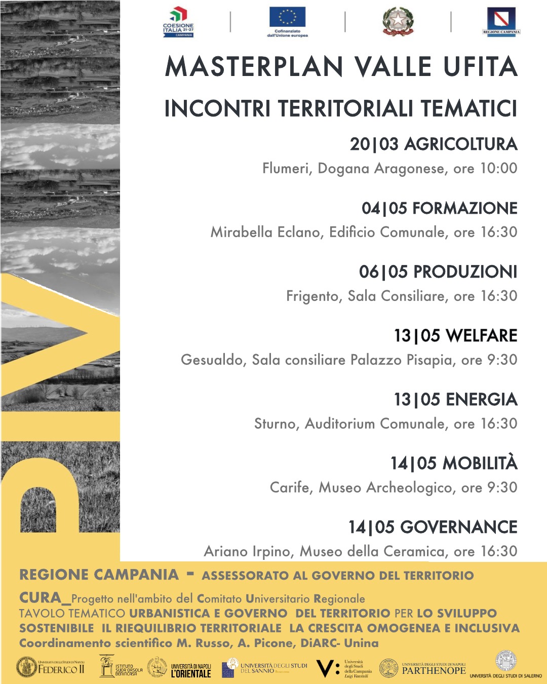 Il Sindaco di Grottaminarda Marcantonio Spera, in qualità di responsabile del Coordinamento Tecnico del Masterplan Valle Ufita ricorda i prossimi appuntamenti propedeutici alla costruzione del Masterplan. In programma ancora 6 incontri territoriali tematici: il 4 maggio a Mirabella Eclano su "Formazione", il 6 maggio a Frigento su "Produzioni", il 13 maggio a Gesualdo e Sturno su "Welfare" e "Energia", il 14 maggio a Carife e Ariano Irpino su "Mobilità" e "Governance".